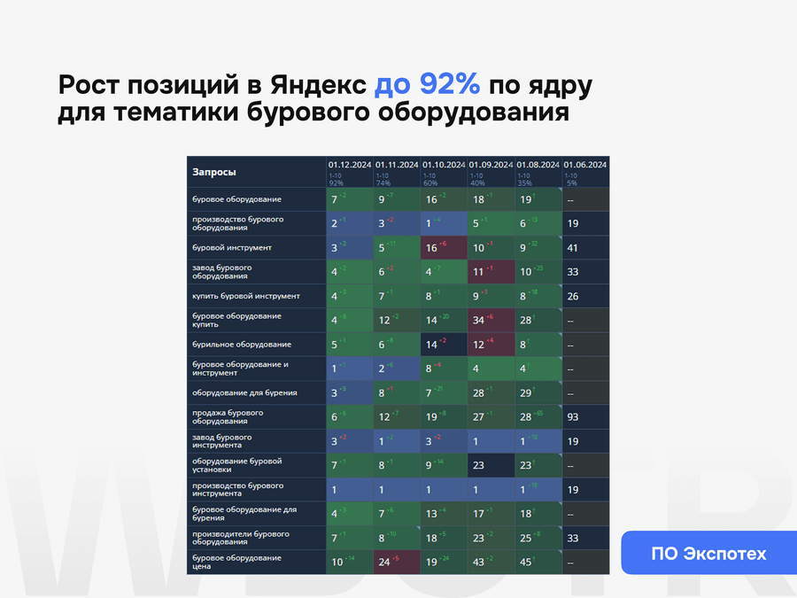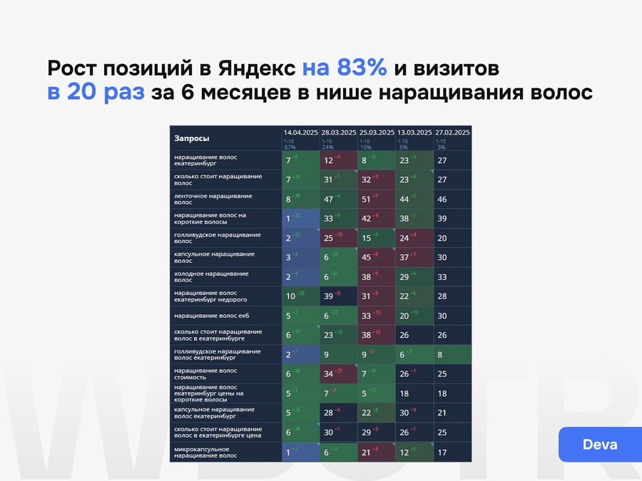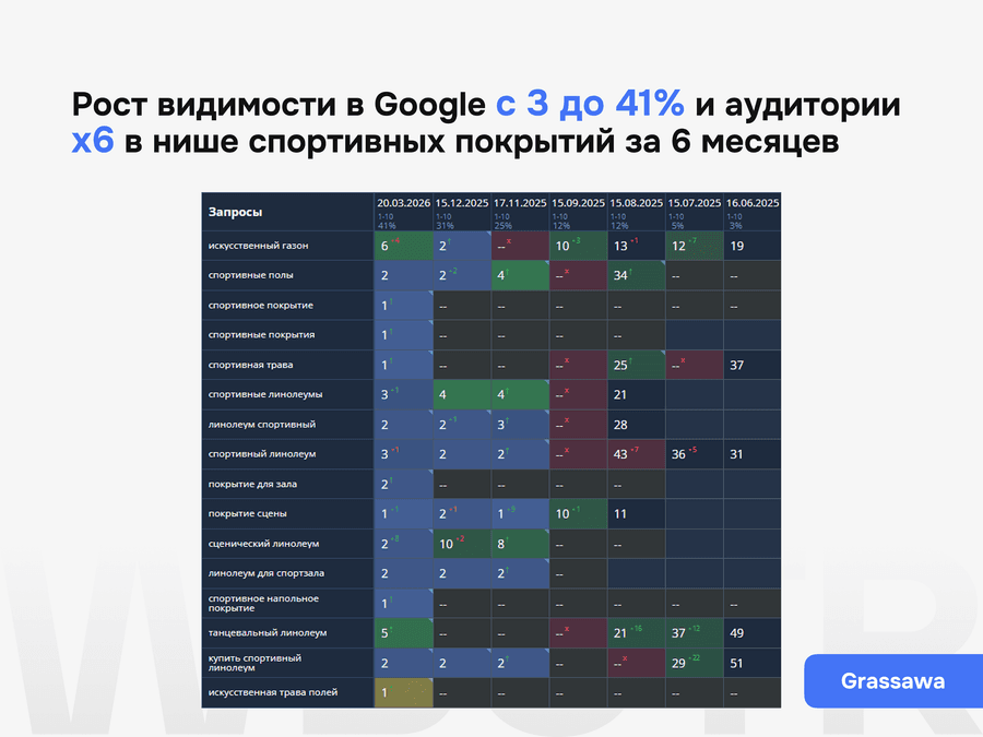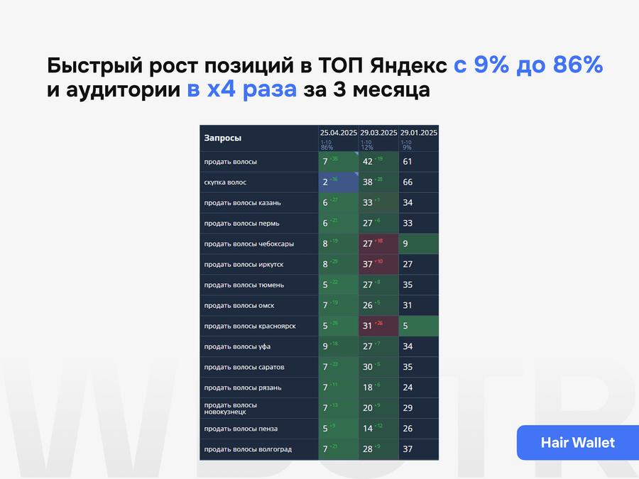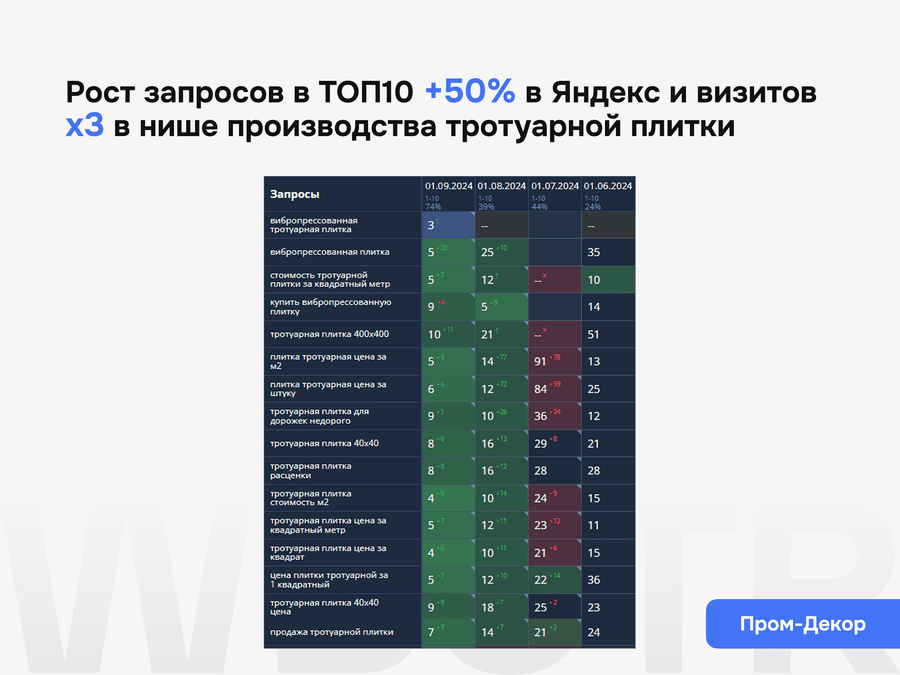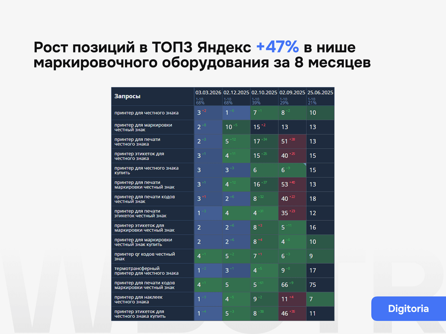 Мы гарантируем прозрачный процесс, понятный план работ, регулярную отчетность, контроль внедрения и работу по согласованной стратегии. Конкретные позиции к определенной дате не гарантируем, потому что результат зависит от состояния сайта, конкуренции, скорости внедрения и реакции выдачи.