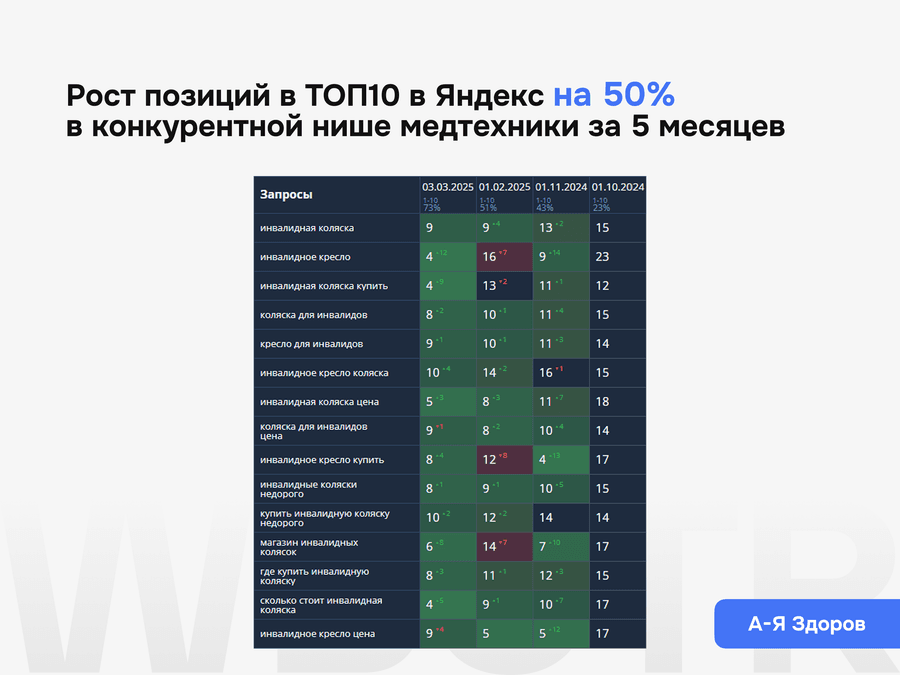 Мы смотрим не только на позиции, но и на бизнес-метрики: целевой органический трафик, заявки, звонки, динамику посадочных страниц и видимость по приоритетным запросам. Для этого используем Яндекс.Метрику, Яндекс.Вебмастер и регулярную отчетность по проекту.